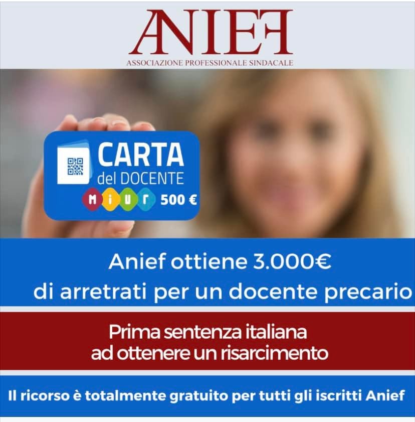 CARD DOCENTE - ANIEF: Sul diritto dei supplenti annuali ad avere la Carta del docente da 500 euro l’anno - Giustizia è fatta