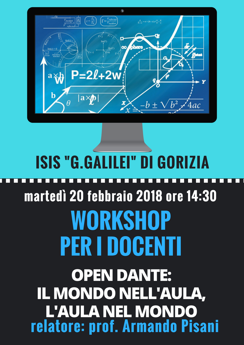 Martedì 20 febbraio il Team Digitale ha proposto, a tutti i docenti, un workshop dal titolo “OpenDante: il mondo nell’aula, l’aula nel mondo”, tenuto dal prof. Pisani Armando, docente di matematica e fisica presso il Liceo Linguistico “M. Buonarroti” di Monfalcone.